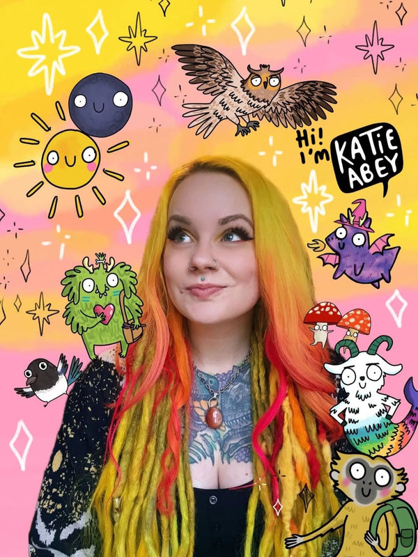 Katie Abey is a creative human committed to the idea that she might just be able to make a positive difference to the world by drawing perturbed animals and lots of rainbows for a living. She used to view her deeply sensitive traits as a flaw but has now harnessed those characteristics into the superpower they are!She now transmutes all of the feelings into all of the art.
