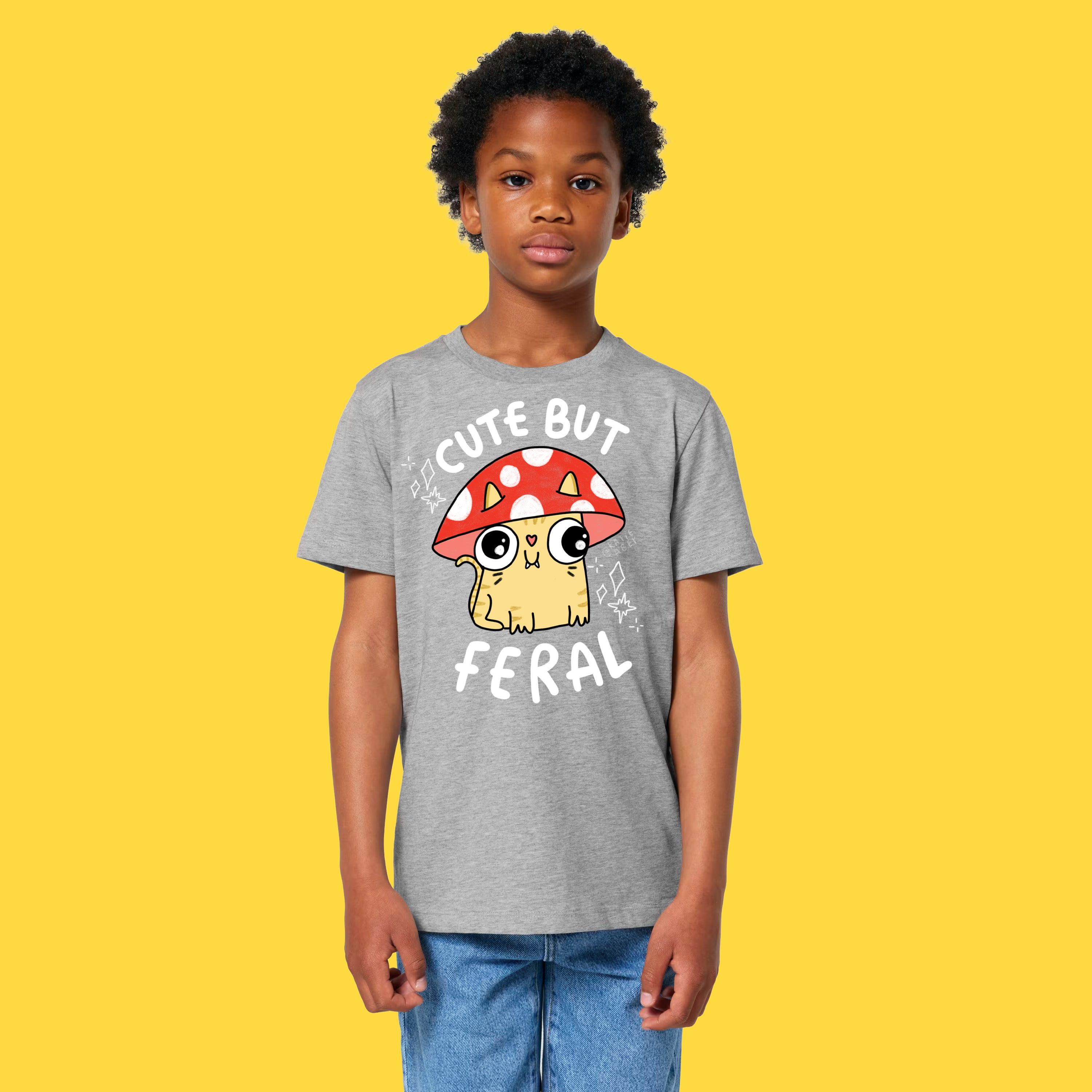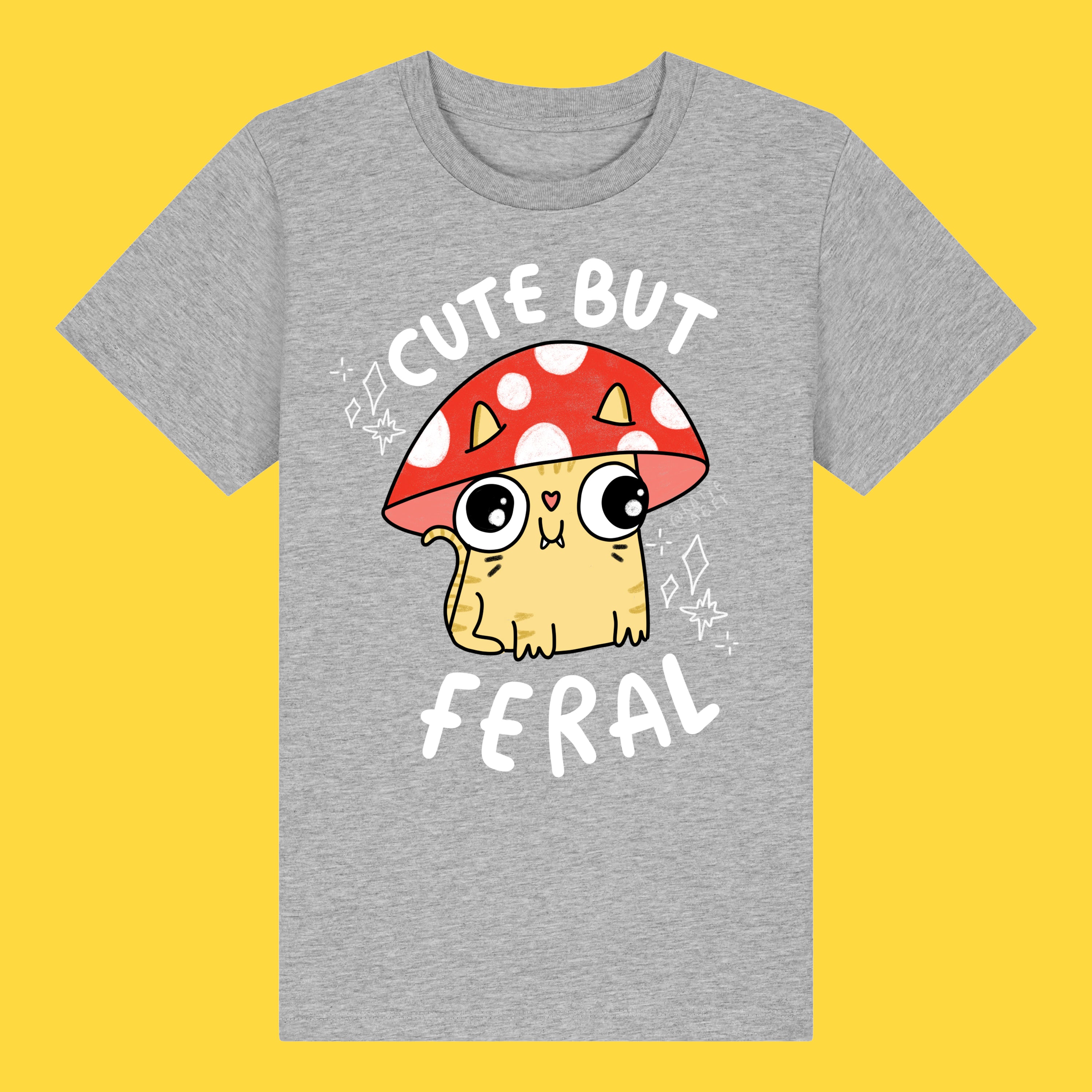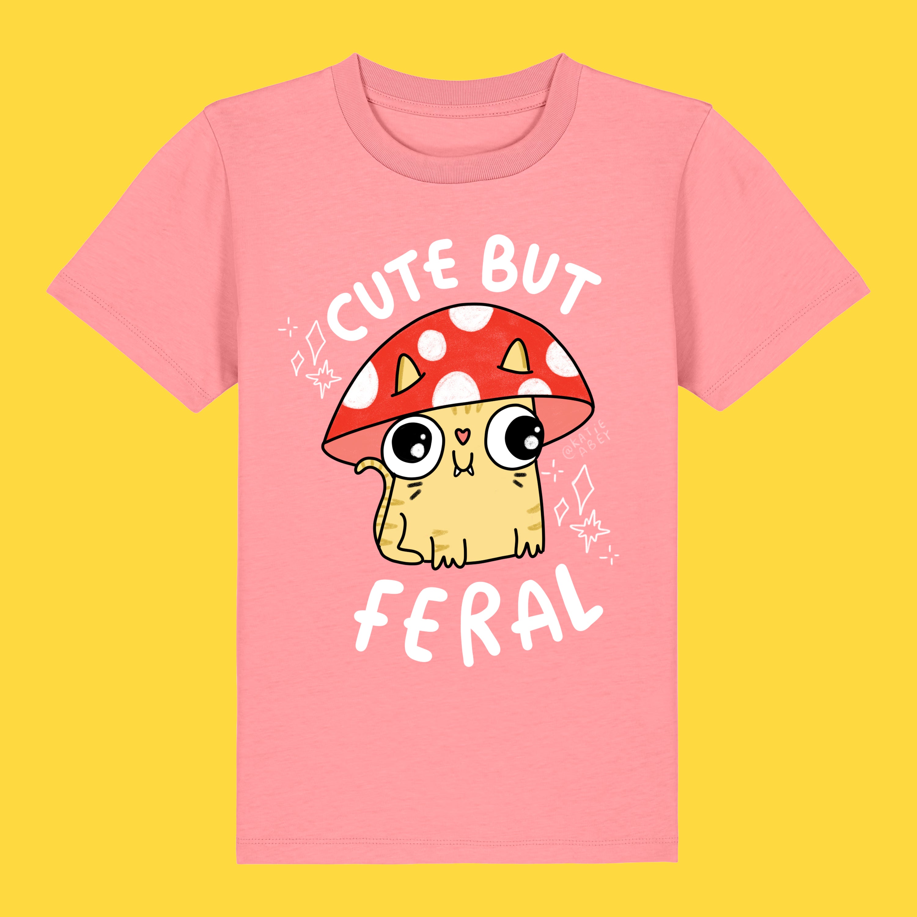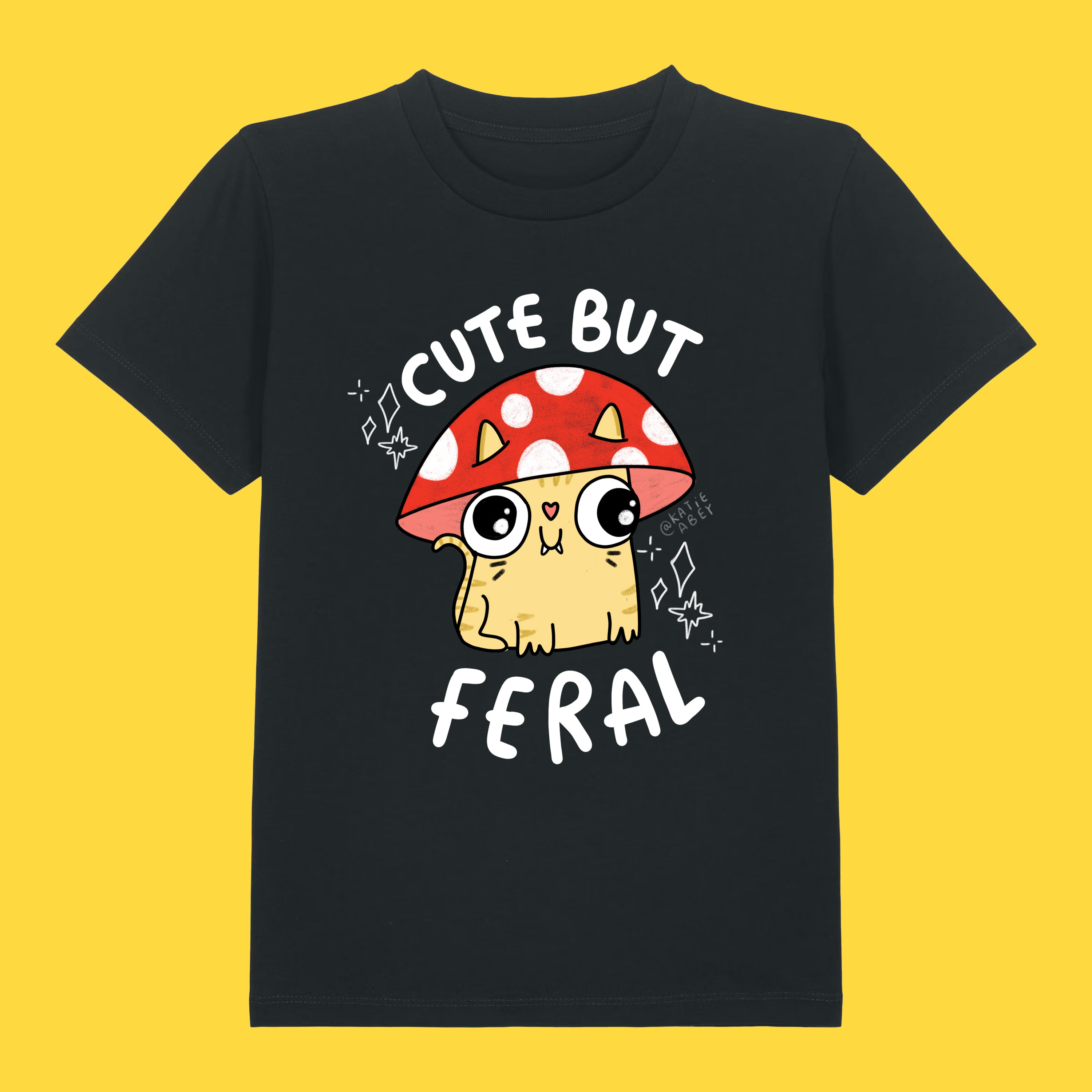 This Cute But Feral Cat Kids Tee is packed with Katie Abey’s signature chaotic cute vibes, featuring a wide eyed kitty hiding under a mushroom cap and proudly owning its feral era. Soft, comfy and made for everyday adventures, big feelings and joyful weirdness!