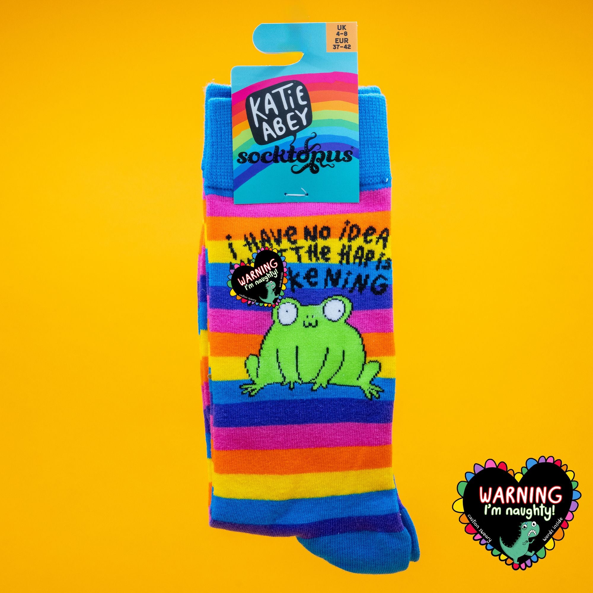 These rainbow striped froggy socks bring maximum serotonin to your feet, featuring a bewildered little frog boi who honestly just needs a nap and a snack. If you love weird, wonderful, and unapologetically silly accessories, these are about to become your new personality.