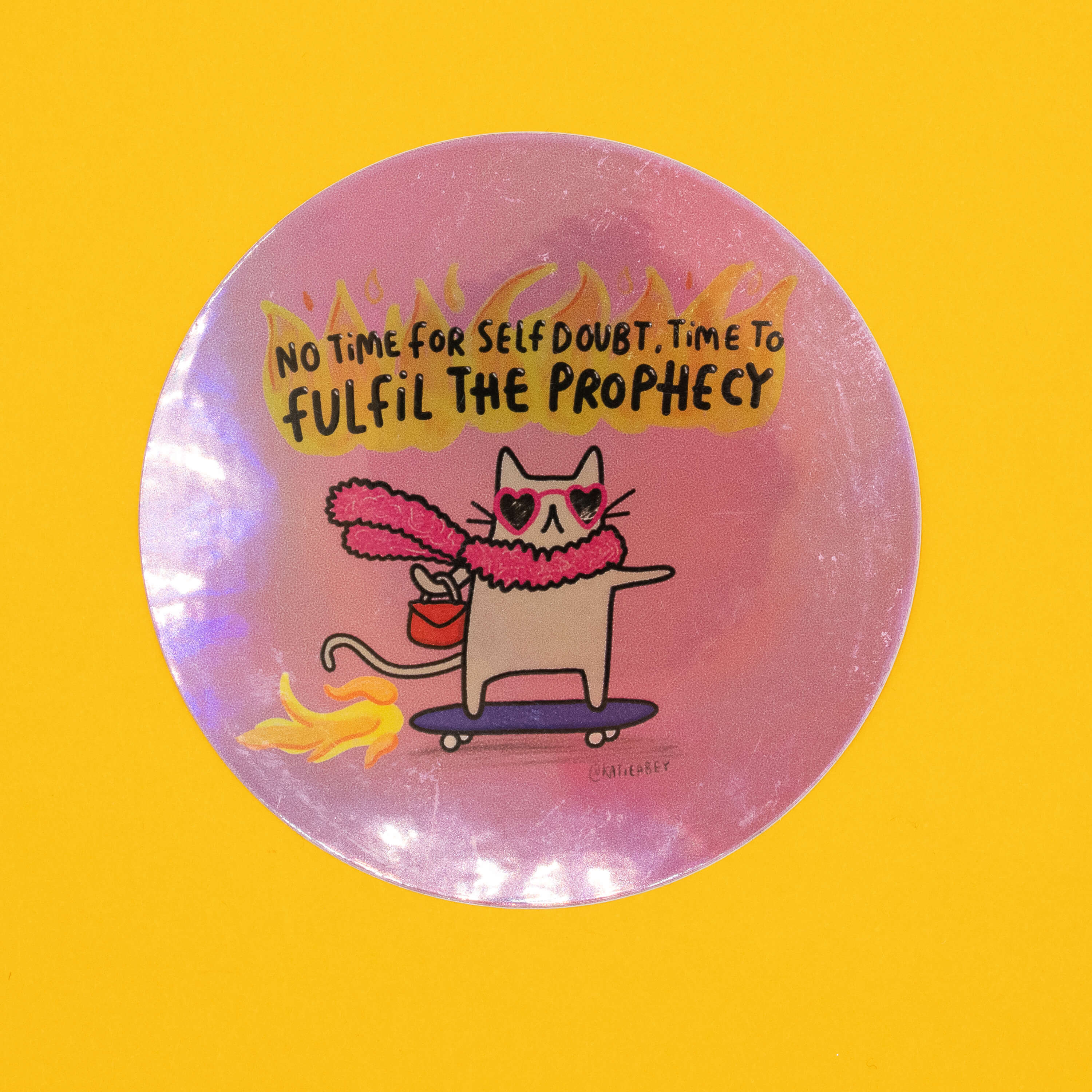 ✨ No time for self-doubt, only time to look fabulous while you fulfil the prophecy! This holographic vinyl sticker by Katie Abey brings maximum weirdness and motivational vibes wherever you stick it.